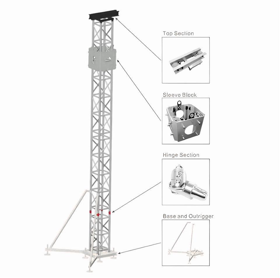 La torre de armadura funciona como un sistema estructural totalmente integrado compuesto por la sección superior, secciones de armadura estándar, bloque de manga, sección de bisagra y base y estabilizador.
