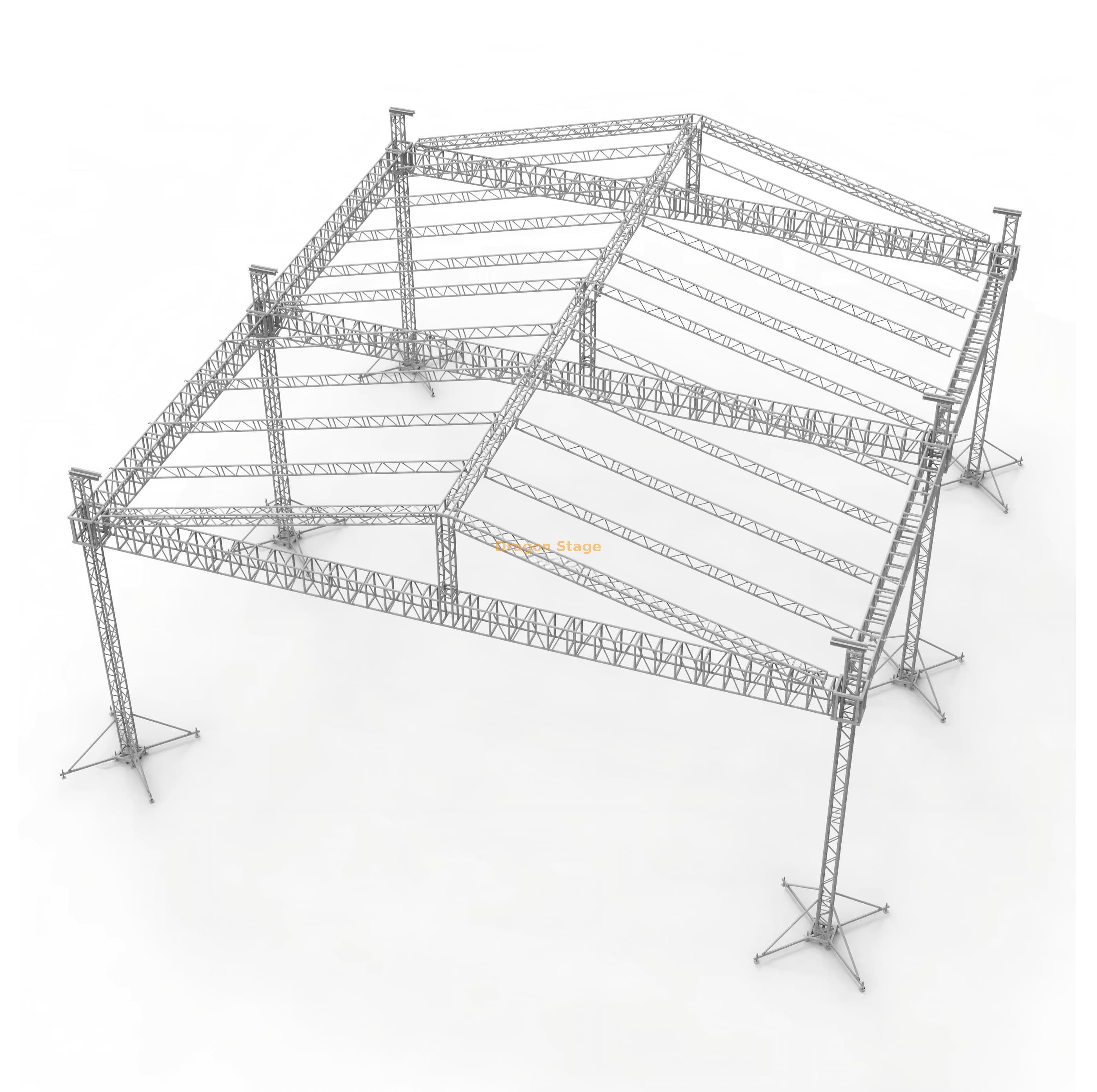 El Dragon Stage armazón para eventos de conciertos grandes de aluminio está diseñado para satisfacer las demandas extremas de producciones masivas al aire libre, incluidos conciertos importantes, grandes festivales de audio y eventos religiosos de gran asistencia. Este sistema cuenta con una huella impresionante de 18 mx 12 m y una altura sustancial de 10 m , sostenido por una robusta estructura de soporte de suelo de 6 pilares . Su utilización del truss principal CS500x600 de alta resistencia garantiza la máxima capacidad de carga para una amplia instalación de iluminación, vídeo y audio en un amplio tramo de 18 metros.