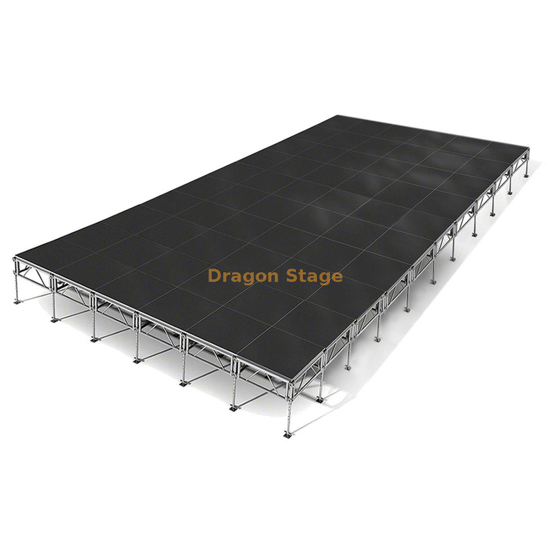 Ofrecemos una amplia gama de **etapas modulares de aluminio** diseñadas para satisfacer sus requisitos específicos. Nuestra configuración estándar incluye un escenario de 12,2 mx 7,32 m (10 x 6 piezas) con una altura ajustable de 0,8 m a 1,2 m. Cada panel de escenario mide 1,22 mx 1,22 m, lo que proporciona una plataforma espaciosa y versátil.