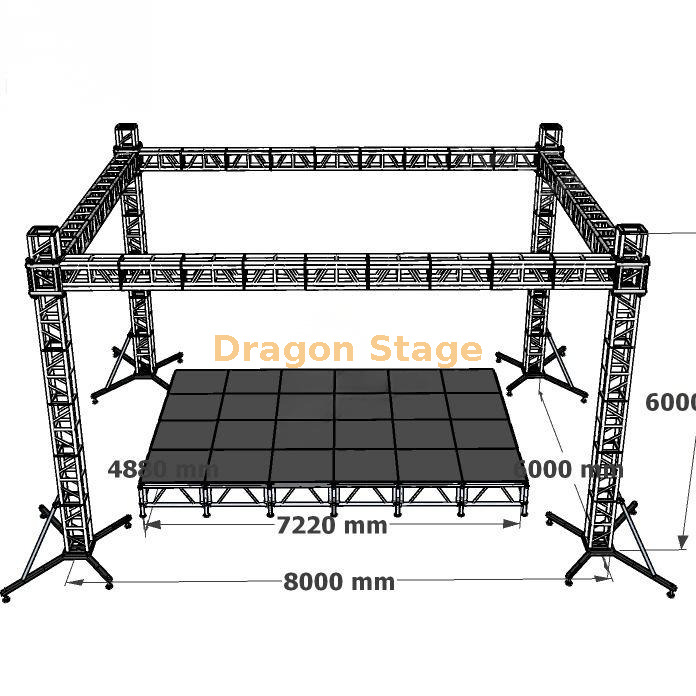 Cobertura expansiva: la estructura de celosía de aluminio de 8 m x 6 m x 6 m proporciona una importante capacidad superior para equipos de iluminación profesionales, sistemas de sonido y pantallas visuales.