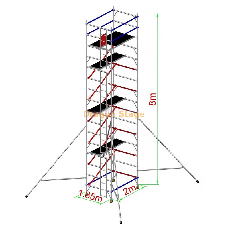 Para los administradores de instalaciones, organizadores de eventos y equipos de mantenimiento industrial, alcanzar alturas de manera segura y eficiente es un requisito diario. La torre de andamio de aluminio de 1,35x2x8,5m de DragonStage es una solución de alto acceso de primer nivel diseñada para ofrecer la máxima estabilidad y portabilidad. Con un ancho de 'doble fila' de 1,35 m, esta torre proporciona un área de trabajo espaciosa y segura que permite tareas de varias personas en alturas de hasta 8,5 metros. Construido con aluminio de calidad aeroespacial, este sistema ofrece la integridad estructural del acero tradicional con una fracción del peso, lo que lo convierte en la opción ideal para estadios, almacenes y sitios de construcción al aire libre.